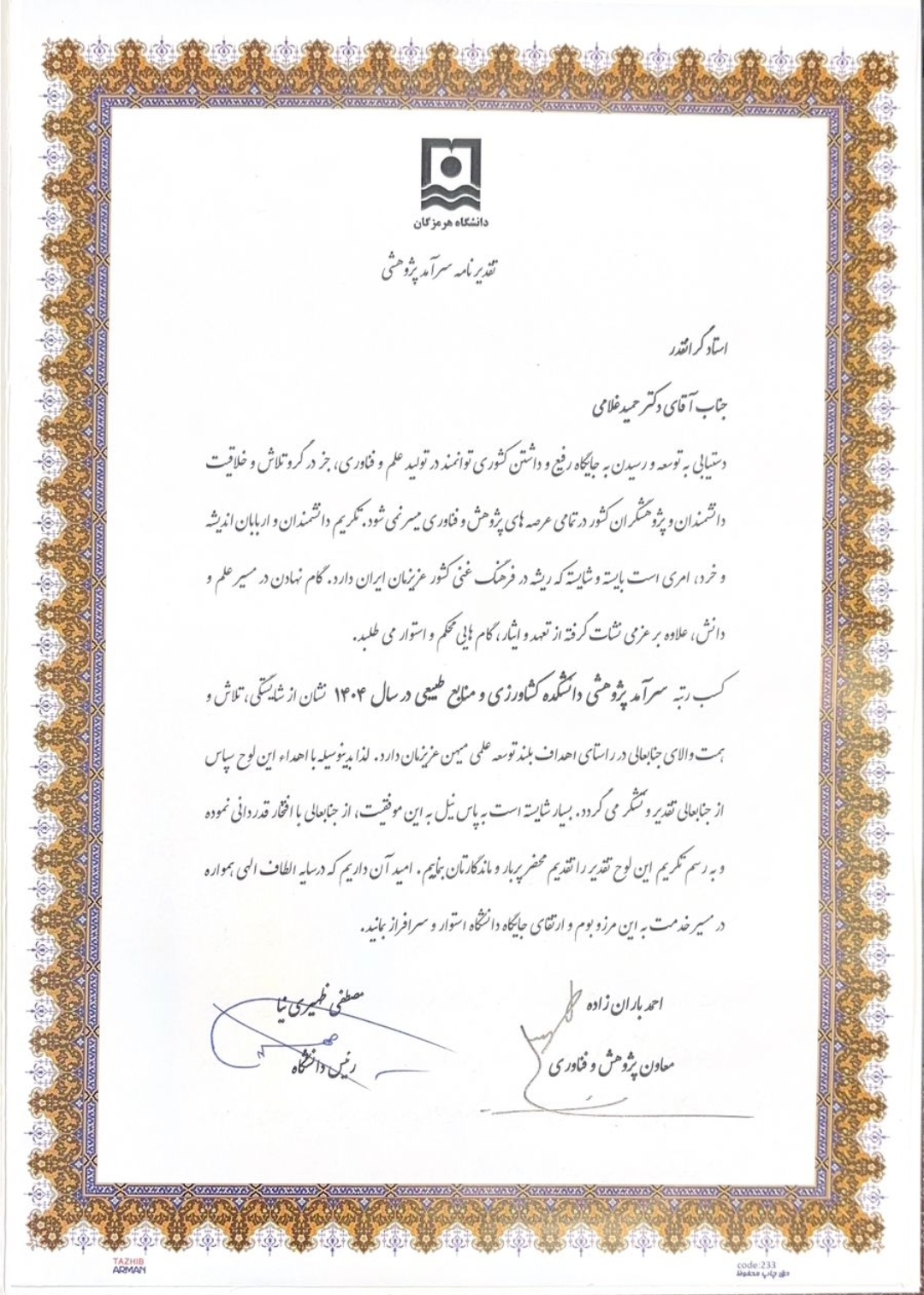 طی مراسمی به مناسبت هفته پژوهش از جناب آقای دکتر حمید غلامی، عضو محترم هیات علمی گروه مهندسی منابع طبیعی، توسط ریاست محترم دانشگاه جناب آقای دکتر ظهیری نیا و معاون محترم پژوهشی و فناوری دانشگاه جناب آقای دکتر احمد باران زاده، برای کسب رتبه سرآمد پژوهشی دانشکده کشاورزی و منابع طبیعی دانشگاه هرمزگان در سال 1404 تقدیر به عمل آمد.