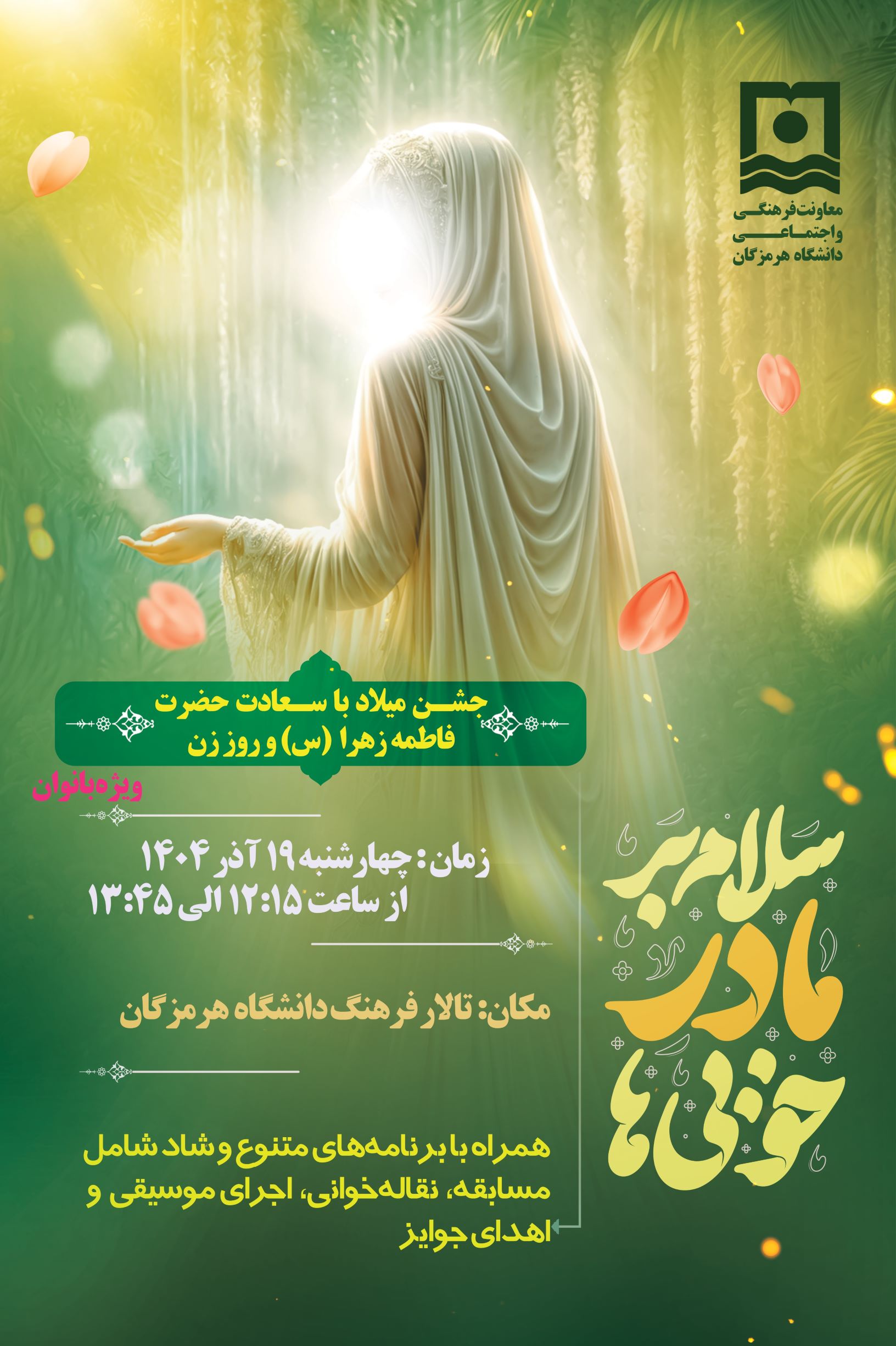 به مناسبت سالروز میلاد پربرکت حضرت فاطمه زهرا (سلام‌الله علیها)، اسوه‌ی پاکی و الگوی بی‌نظیر زنان عالم و بزرگداشت مقام والای مادر و روز زن، معاونت فرهنگی و اجتماعی دانشگاه هرمزگان با افتخار میزبان شما عزیزان است.