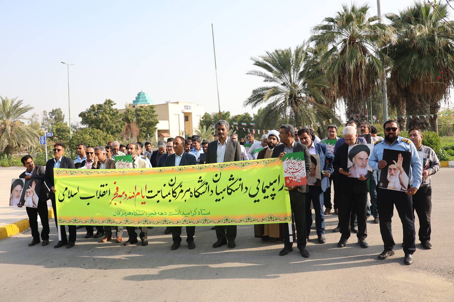 راهپیمایی به مناسبت فرارسیدن دهه مبارک فجر و سالروز پیروزی شکوهمند انقلاب اسلامی ایران، با حضور اعضای هیئترئیسه، اساتید وکارکنان دانشگاه برگزار شد. این مراسم با هدف گرامیداشت ایامالله دهه فجر، تجدید میثاق با آرمانهای والای انقلاب اسلامی و پاسداشت یاد و خاطره امام خمینی (ره) و شهداء برگزار گردید. شرکتکنندگان با حضور پرشور خود، ضمن سر دادن شعارهای انقلابی، بر پایبندی به ارزشهای انقلاب اسلامی و ادامه راه شهدا تأکید کردند.