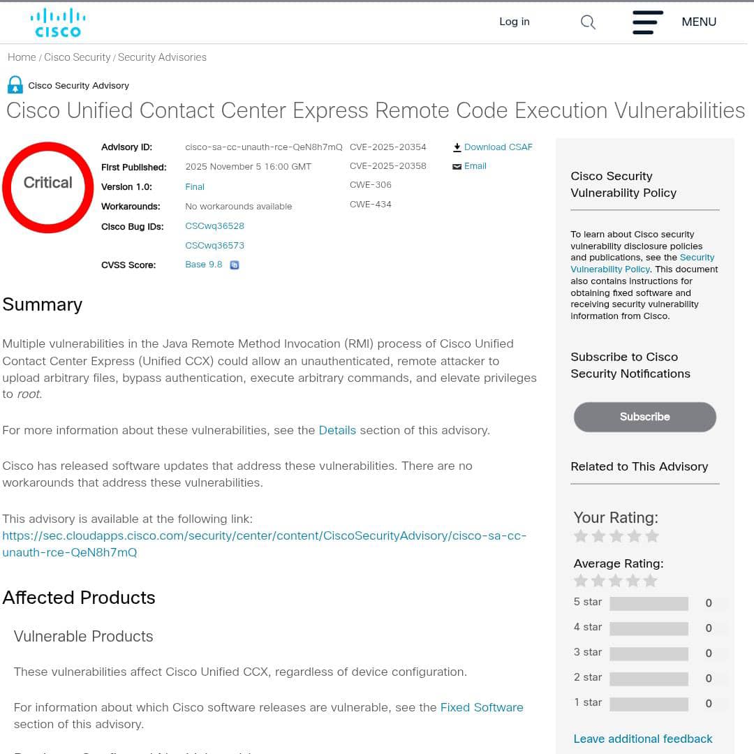 ⚠️ آسیبپذیری بحرانی در Cisco Unified CCX — اجرا کد از راه دور (RCE)
